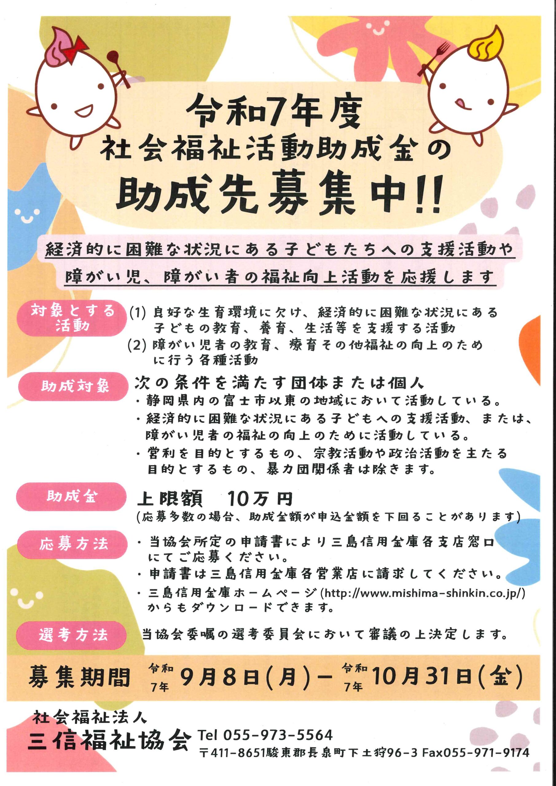 社会福祉法人三信福祉協会から「令和7年度 社会福祉活動助成金の助成金交付先募集要項」が公表されました。経済的に困難な状況にある子どもたちへの支援活動や、障がい児、障がい者の福祉向上活動を行う団体に対する助成先の募集です。